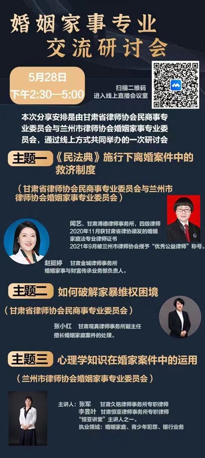 2022年5月28日下午,甘肃省律师协会民商事专业委员会(以下简称“省律协民商委”)与兰州市律师协会婚姻家事专业委员会(以下简称“市律协婚家委”),通过线上方式举办“婚姻家事专业交流研讨会”,三十余位委员参加本次交流活动。