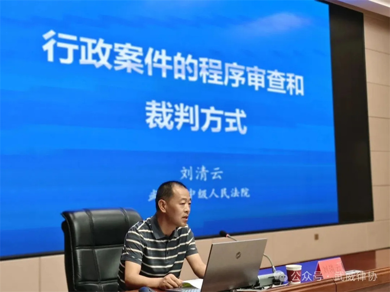 上午10时,武威市中级人民法院审判委员会委员、行政审判庭庭长刘清云就"行政案件的程序审查及裁判方式"进行专题授课。刘庭长从审判实务角度,详细解析了行政案件审理的关键环节和裁判要点,为律师办理行政案件提供了宝贵指导。