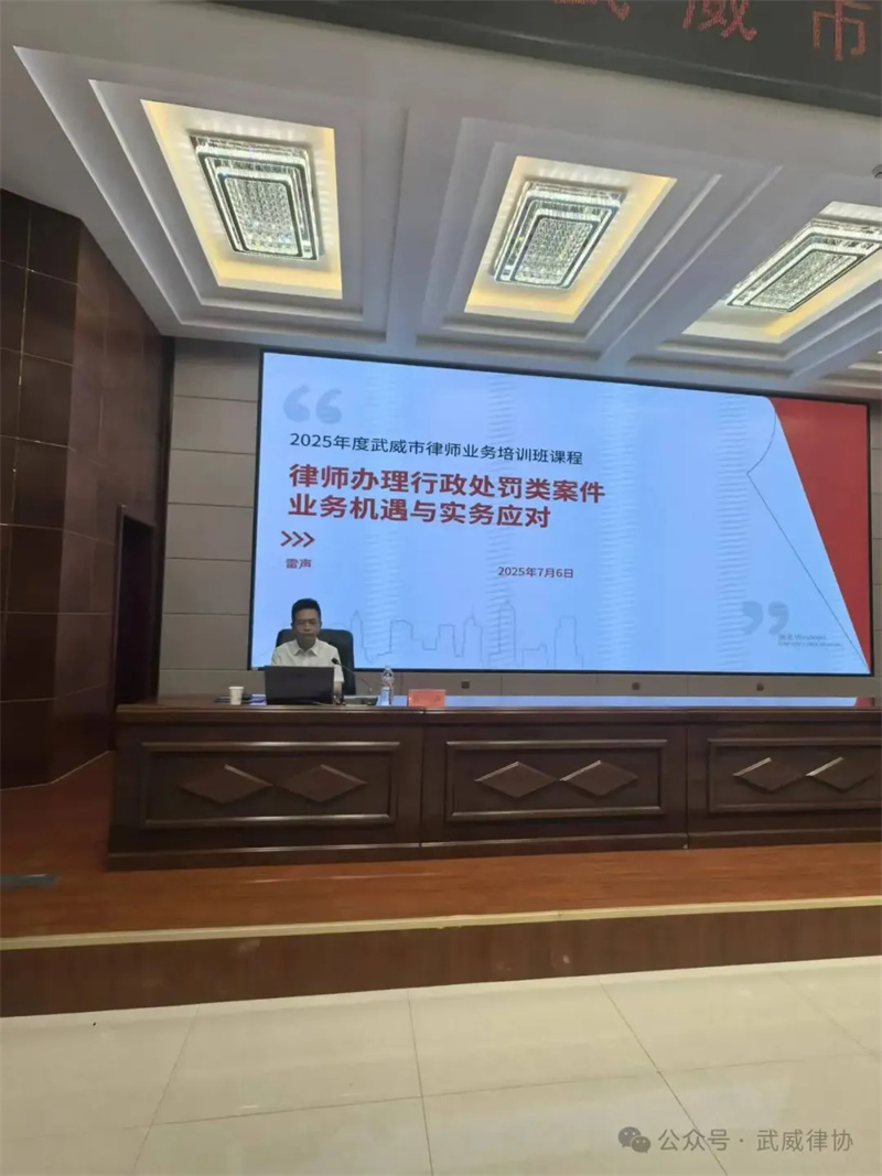 甘肃省律师协会副会长、甘肃雷诺律师事务所主任雷声就"律师办理行政处罚类案件的业务机遇与实务应对"进行专题授课。雷会长从行政处罚案件的类型特点入手,深入分析了律师在行政处罚案件中的业务机会,并分享了实务操作中的技巧与策略。