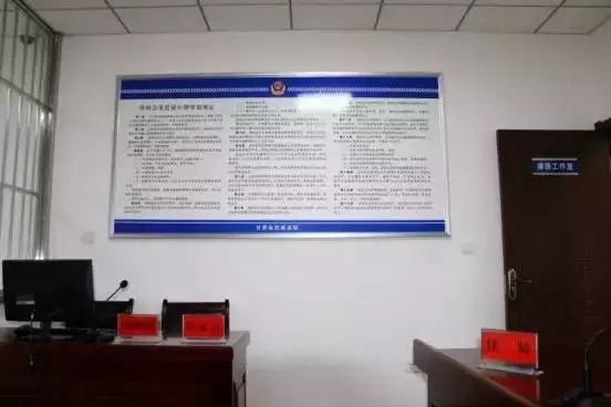 工作室设在监狱罪犯接见楼,室内悬挂《律师会见监狱在押罪犯规定》《武威监狱律师会见监狱在押罪犯流程》,配备工作桌椅、电脑等办公用品,设置律师、助理员、记录员、监督员座次。