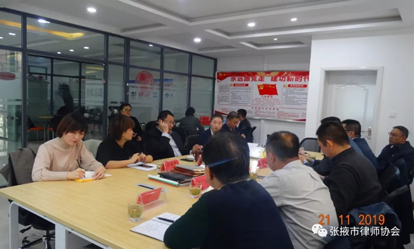 根据中共甘肃省律师行业委员会关于开展“不忘初心,牢记使命”主题教育巡回指导暨规范化律师事务所建设审核工作通知的安排部署,2019年11月21日,省律师行业党委、省律师协会巡回指导组第三小组、省律师行业党委委员、省律协秘书长张维武,省律协副会长王祖国,省律协副秘书长赵庆华等一行莅临我市,深入部分律师事务所巡回指导律师行业党建工作和“不忘初心,牢记使命”主题教育活动,检查律所规范化建设。张掖市司法局副局长左鹏,张掖市司法局政治部主任、张掖市律师行业党委书记曹国虎,张掖市律师协会会长李爱国、副会长丁志娟等同志陪同检查。