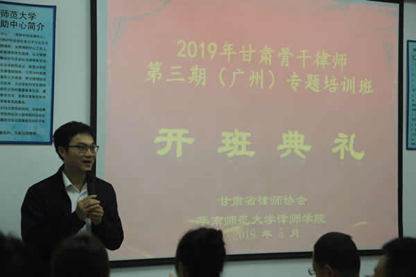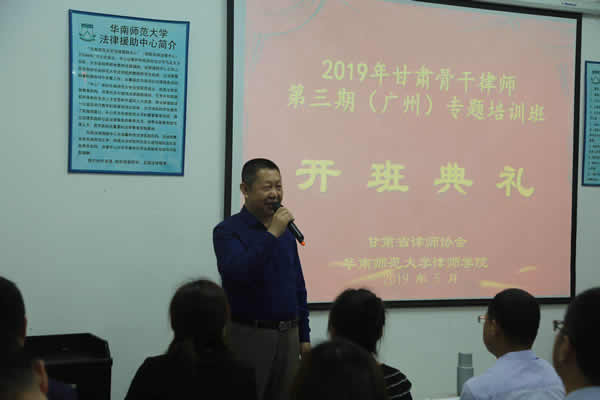 甘肃律协秘书长张维武、华南师范大学律师学院院长张永忠出席开班仪式并致辞,律师学院副院长廖克环主持开班仪式。全省各市州70名骨干律师参加培训。