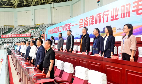 全省各市州律师协会组建的13支参赛队在欢快的运动员进行曲中,挥舞着手中的五星红旗依次入场。随后,全体人员起立,奏唱中华人民共和国国歌,比赛在庄严的国歌声中正式拉开帷幕!